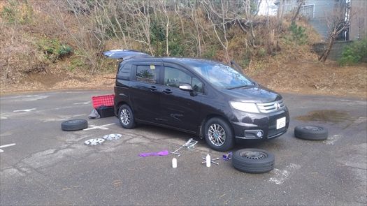 2017-12-06 スパイクとノボリとジョセツ お仕事 待ちに待った車がやってきました。ずっと仕事用の商用車ばかりでしたが、フリードスパイクでございます。納車後20分後にはスタッドレスに交換。一応確認のため全て車載工具で作業してみました。型落ちになるけどフリードいい車ですねぇ、とっても気に入りました。ほとんどお嫁さんが乗ることになります^^さぽーとオリジナルノボリも作ったよ^^今日は初の除雪依頼で出動!合間みて2018年さぽーとカレンダーも配布中です。