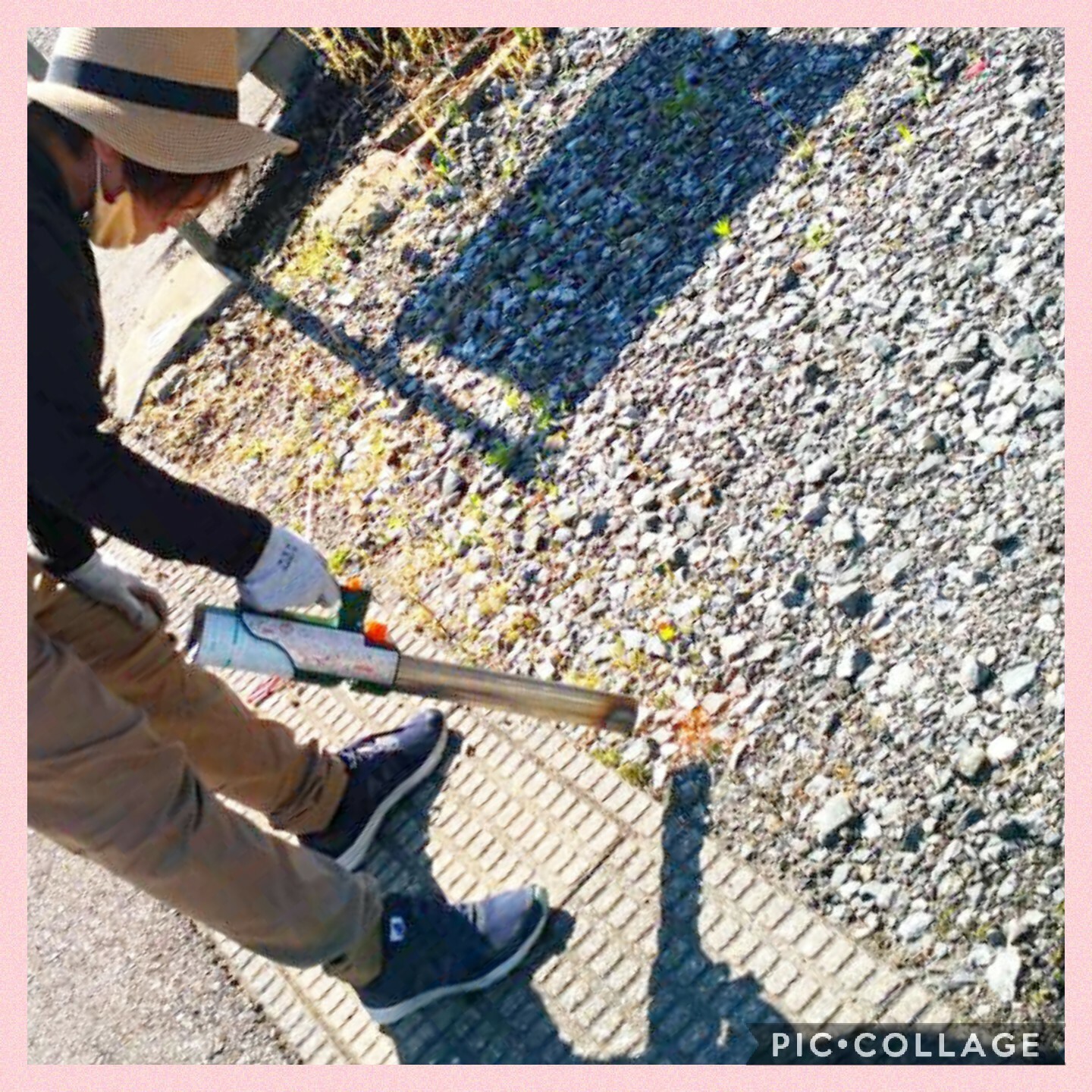 手取りしきれない砂利の間から生えている草などはバーナーで焼きます。