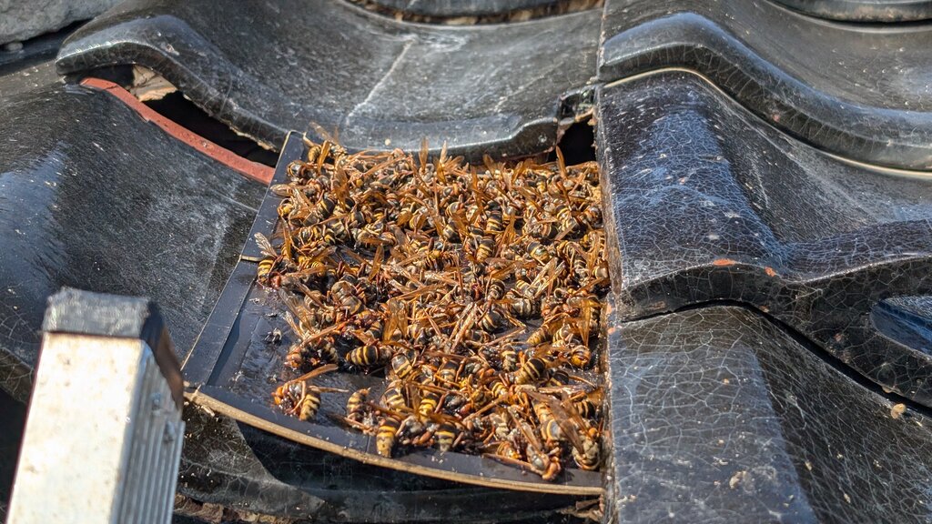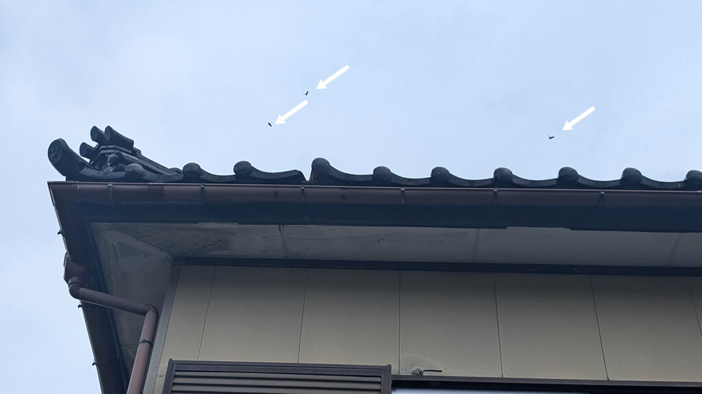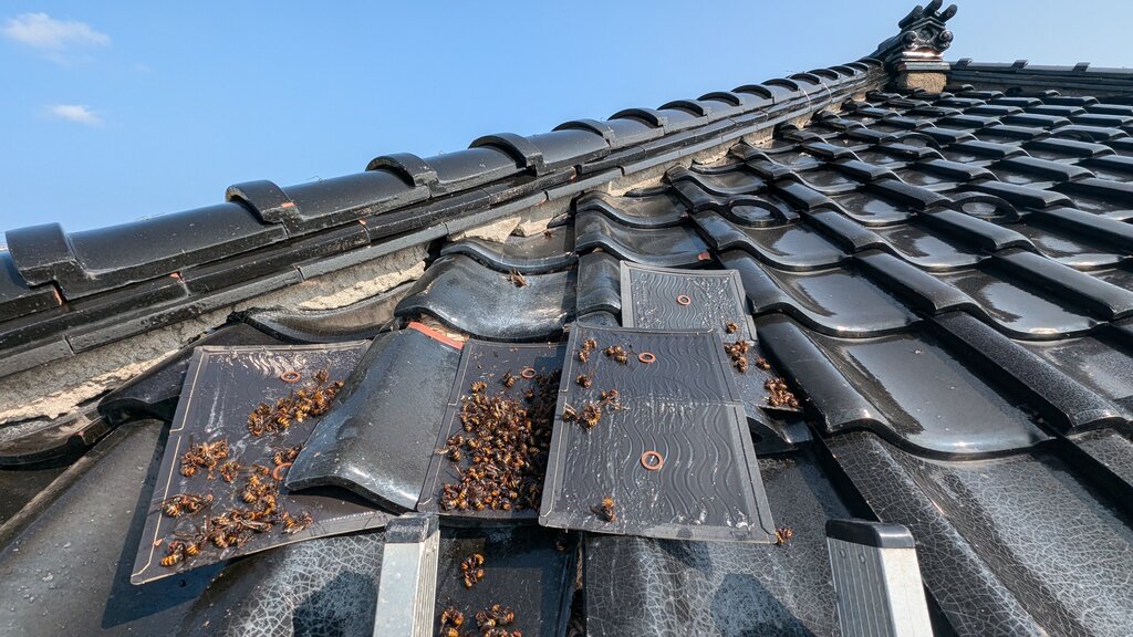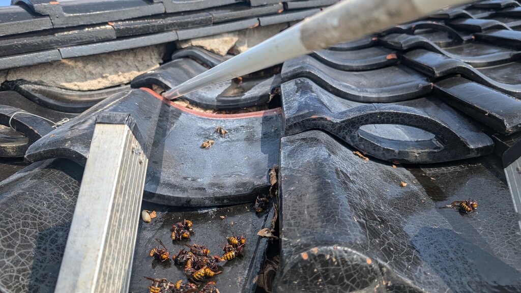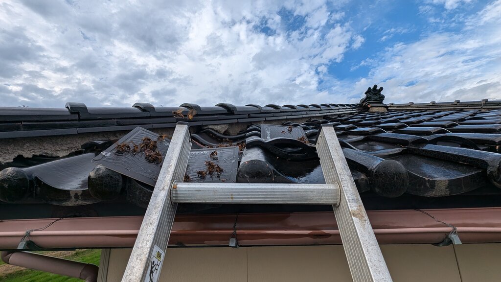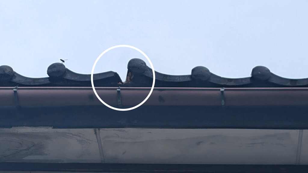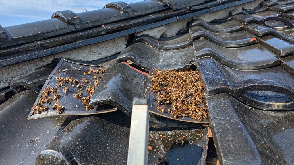 数枚の瓦がずれていたのが原因でしたが、もともとずれてなくても瓦の隙間にはよくスズメバチが巣を作ります。
